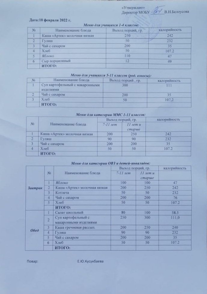 (Меню на 10 февраля)