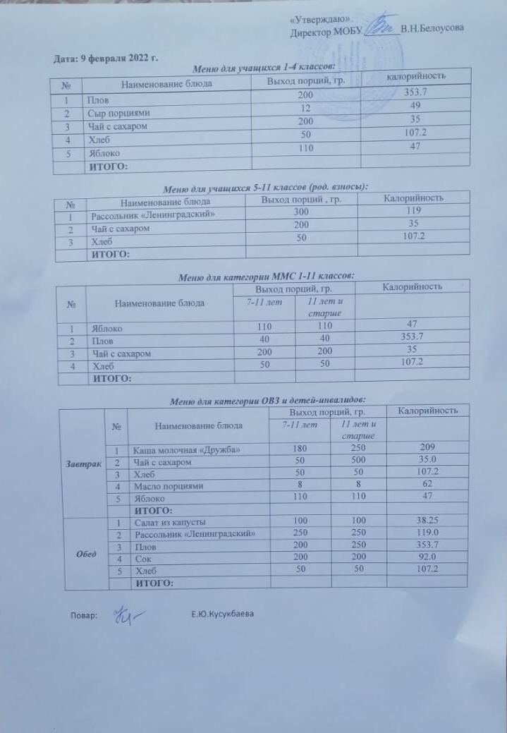 (Меню на 9 февраля)