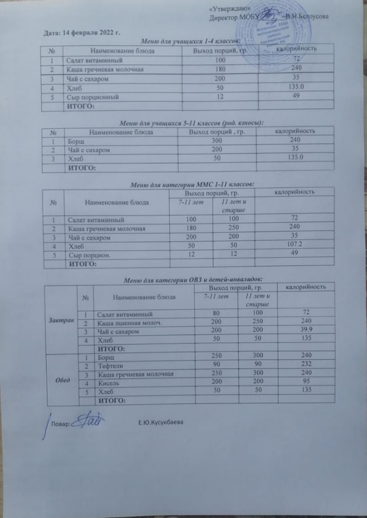(Меню на 14 февраля)
