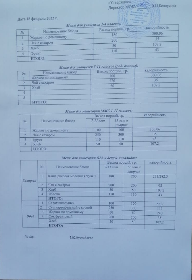 (Меню на 18 февраля)