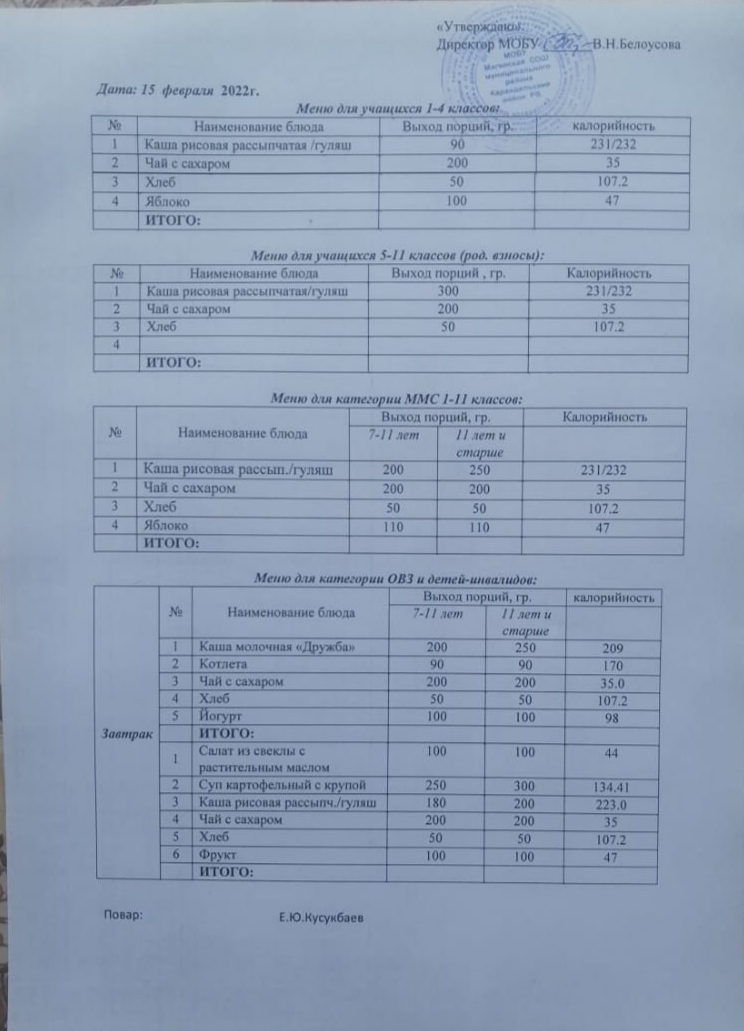 (Меню на 15 февраля)