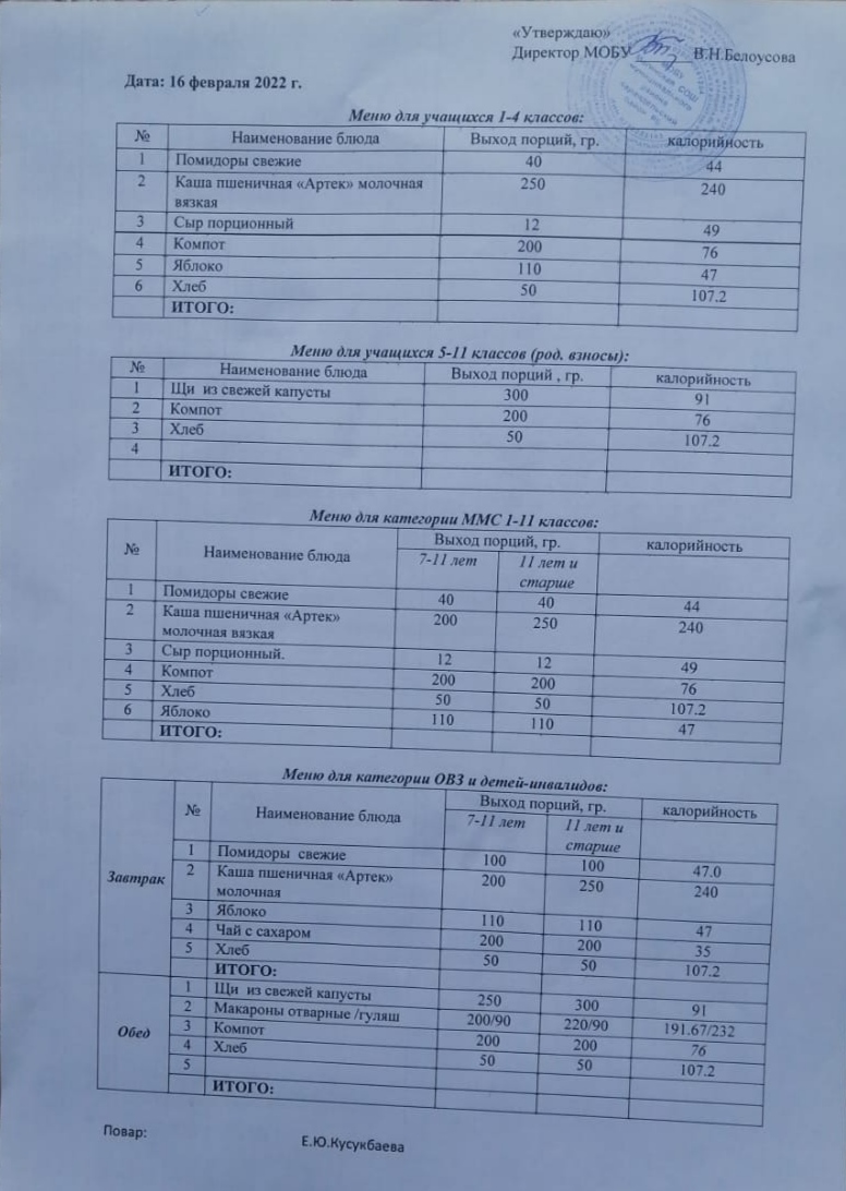 (Меню на 16 февраля)