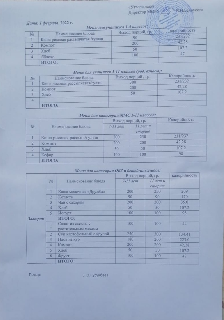 (Меню на 1 февраля)