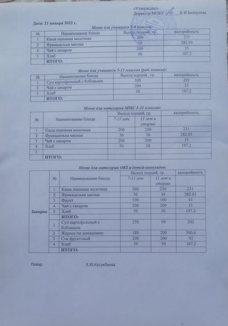 (Меню на 21 января)