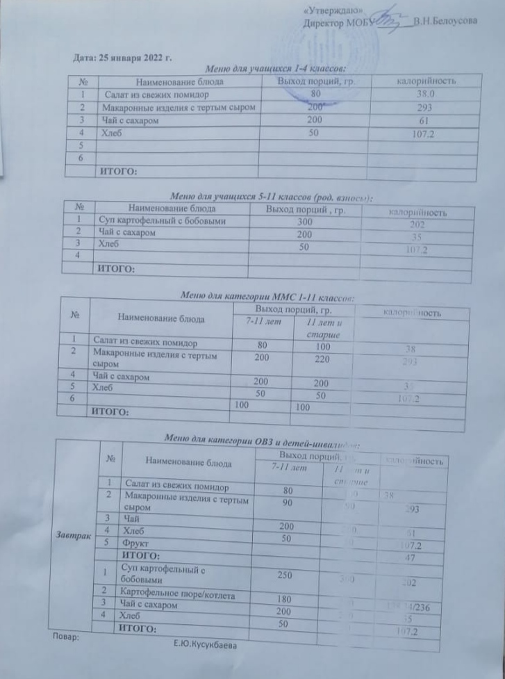 (Меню на 25 января)
