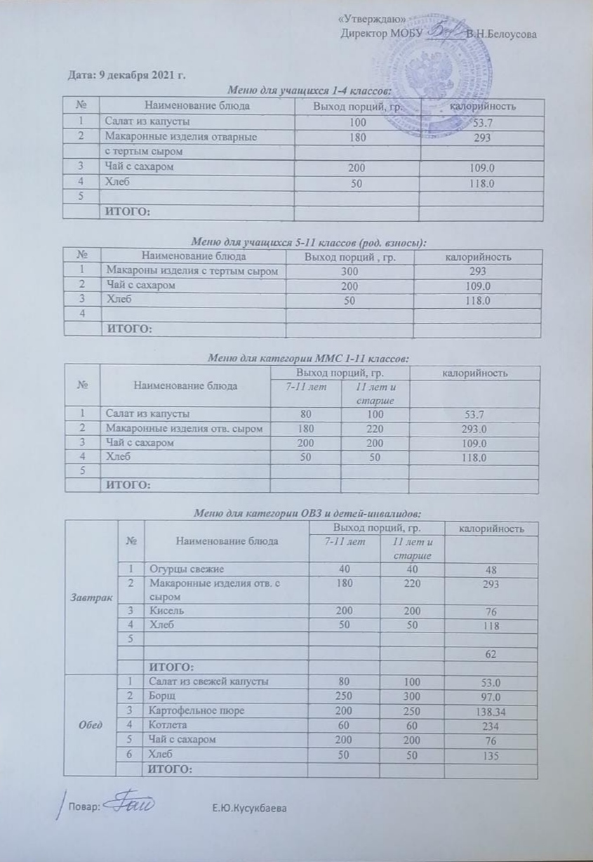 (Меню на 9 декабря)